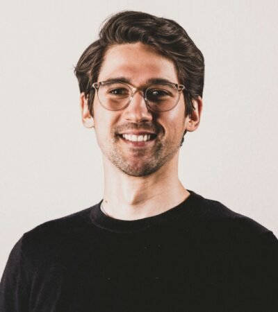 A dimly lit art studio with several abstract paintings displayed on the walls and easels. One prominent painting in the foreground features swirling strokes of pink, yellow, and red. There is a chair and some other art supplies scattered around the studio, creating an atmosphere of creativity and work in progress.